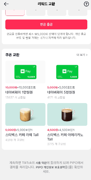 네이버페이 또는 스타벅스 커피로 교환이 되어요