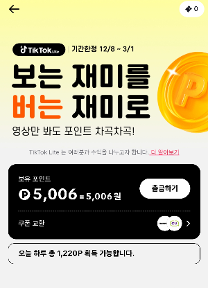 스마트폰으로 할 수있는 여러가지 재테크 중에서 이번엔 틱톡라이트를 소개 해 볼게요