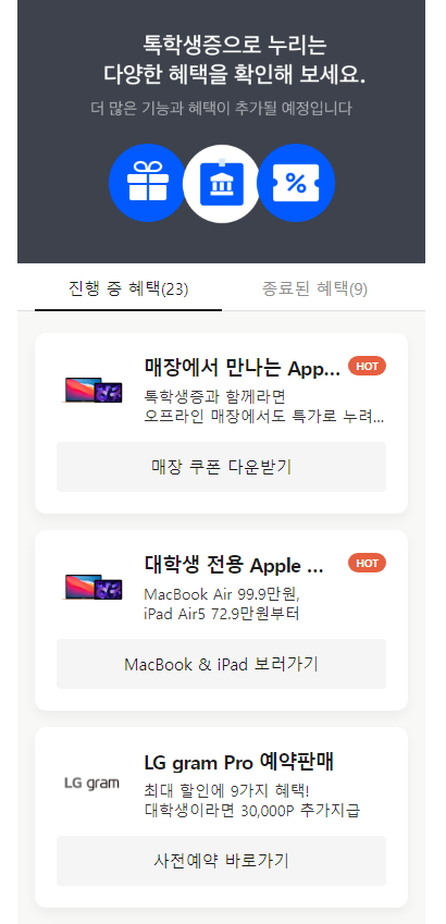 애플 의 경우 유니데이즈에서 학교 인증을 하면 학생혜택을 받을수가 있다고 알고 있고 ,삼성의 경우도 그런 혜택이 있는걸로 알고 있었는데 , 카카오톡 톡학생증으로 이런 혜택이 ..